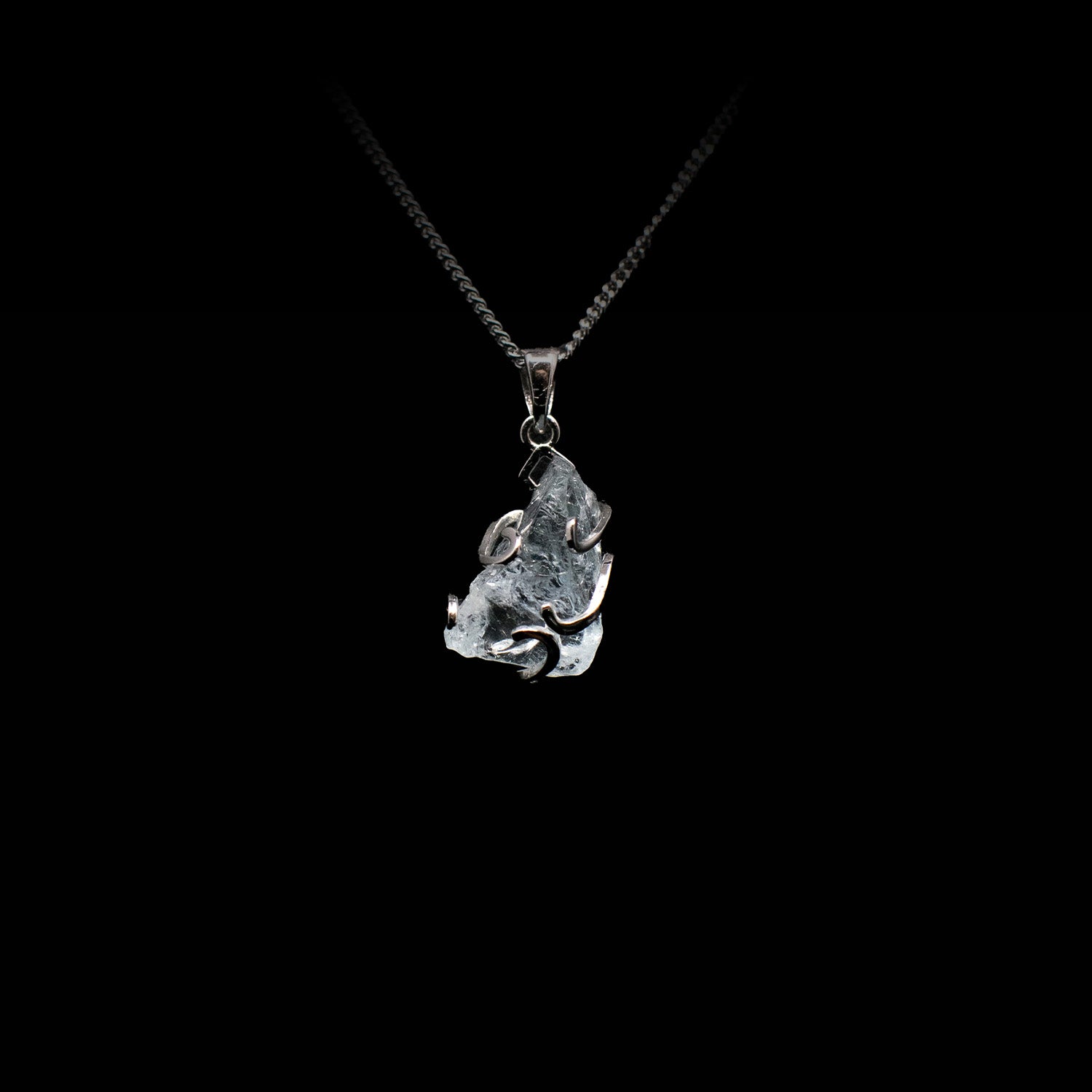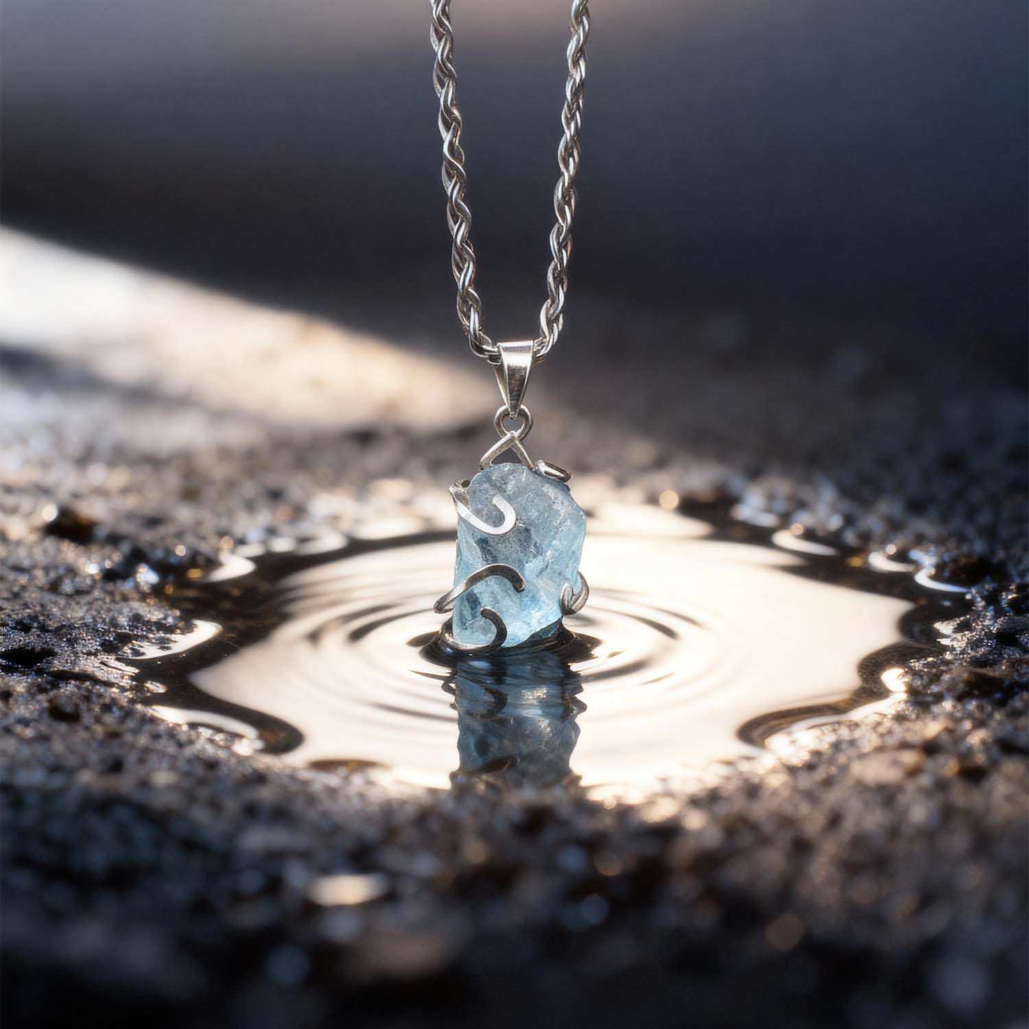 Handgefertigt in der Schweiz aus feinem 925er Sterling-Silber (rhodiniert) und einem seltenen, unbehandelten Aquamarin – roh belassen, um die ursprüngliche Schönheit der Natur zu bewahren und die sanfte Kraft dieses besonderen Steins spürbar zu machen.