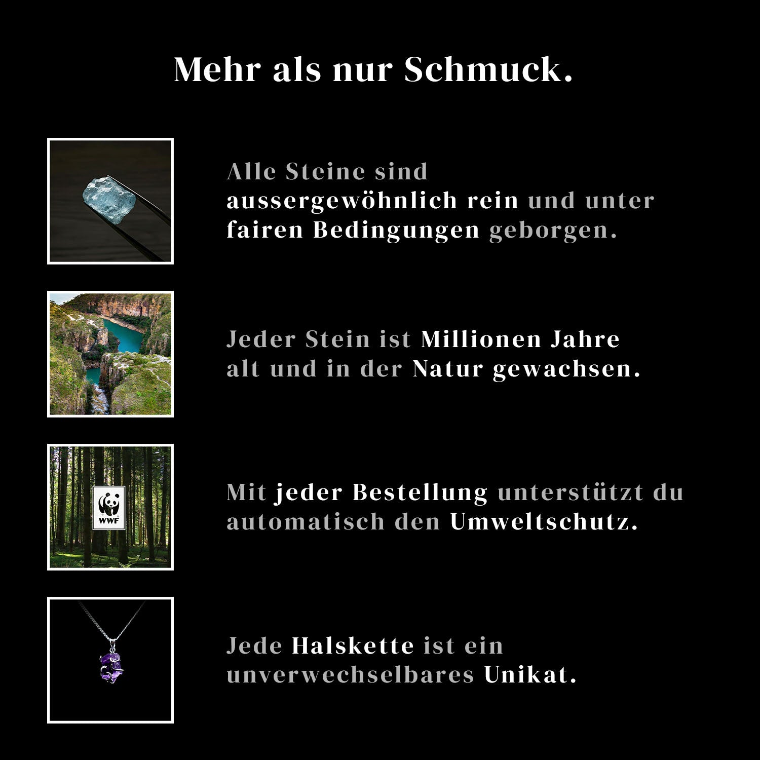 Edelsteine sind mehr als Schmuck – sie sind Geschenke der Erde, entstanden über Millionen von Jahren im Inneren unseres Planeten. Mit jedem Schmuckstück, das wir in die Welt bringen, nehmen wir uns einen Teil dieser Schönheit aus der Natur. Doch wir wollen nicht nur nehmen, sondern auch zurückgeben. Deshalb spenden wir für jede Bestellung CHF 10.– an den WWF Schweiz. Jedes Schmuckstück trägt damit nicht nur den Glanz der Erde in sich, sondern auch die Hoffnung, dass diese Schätze für kommende Generationen erhalten bleiben.