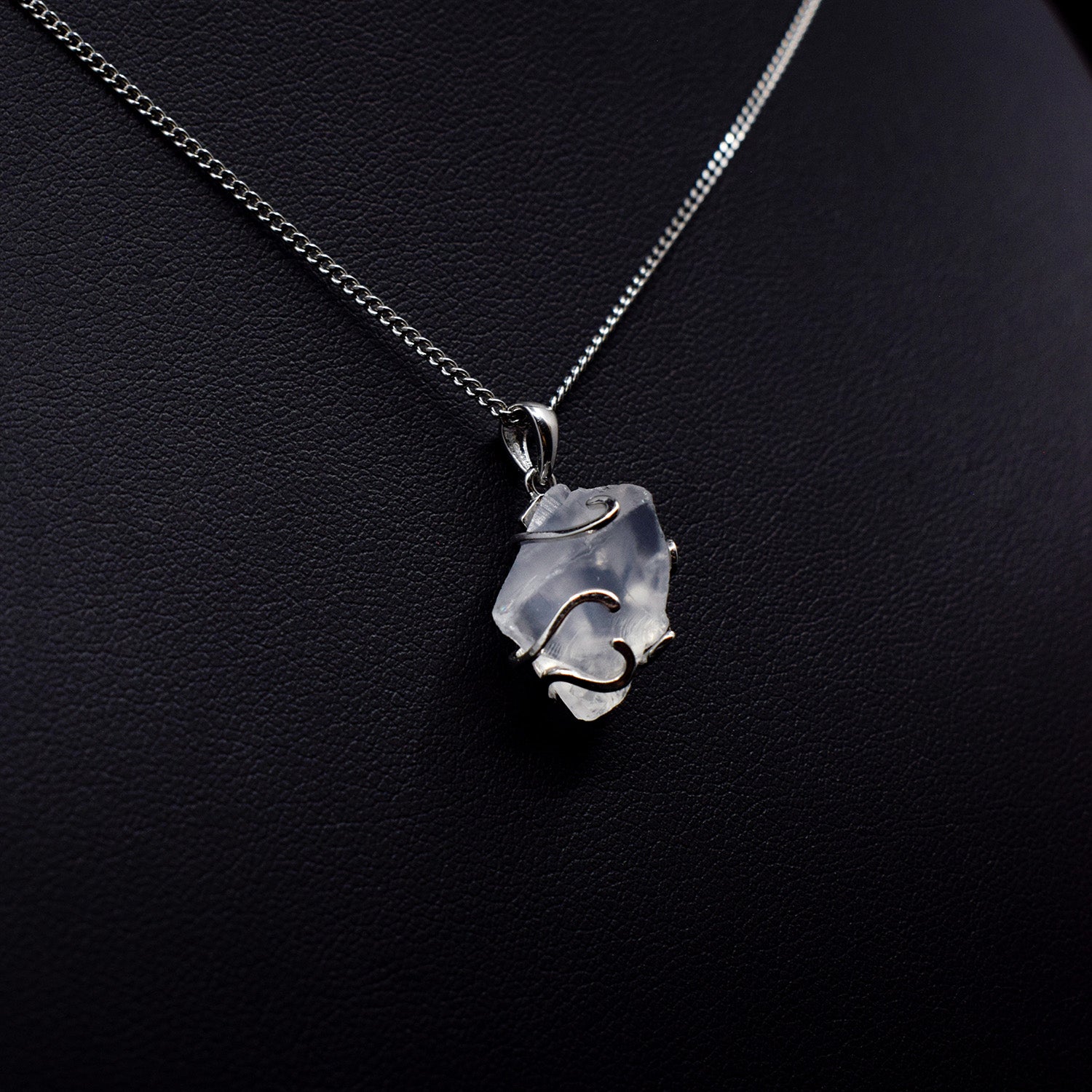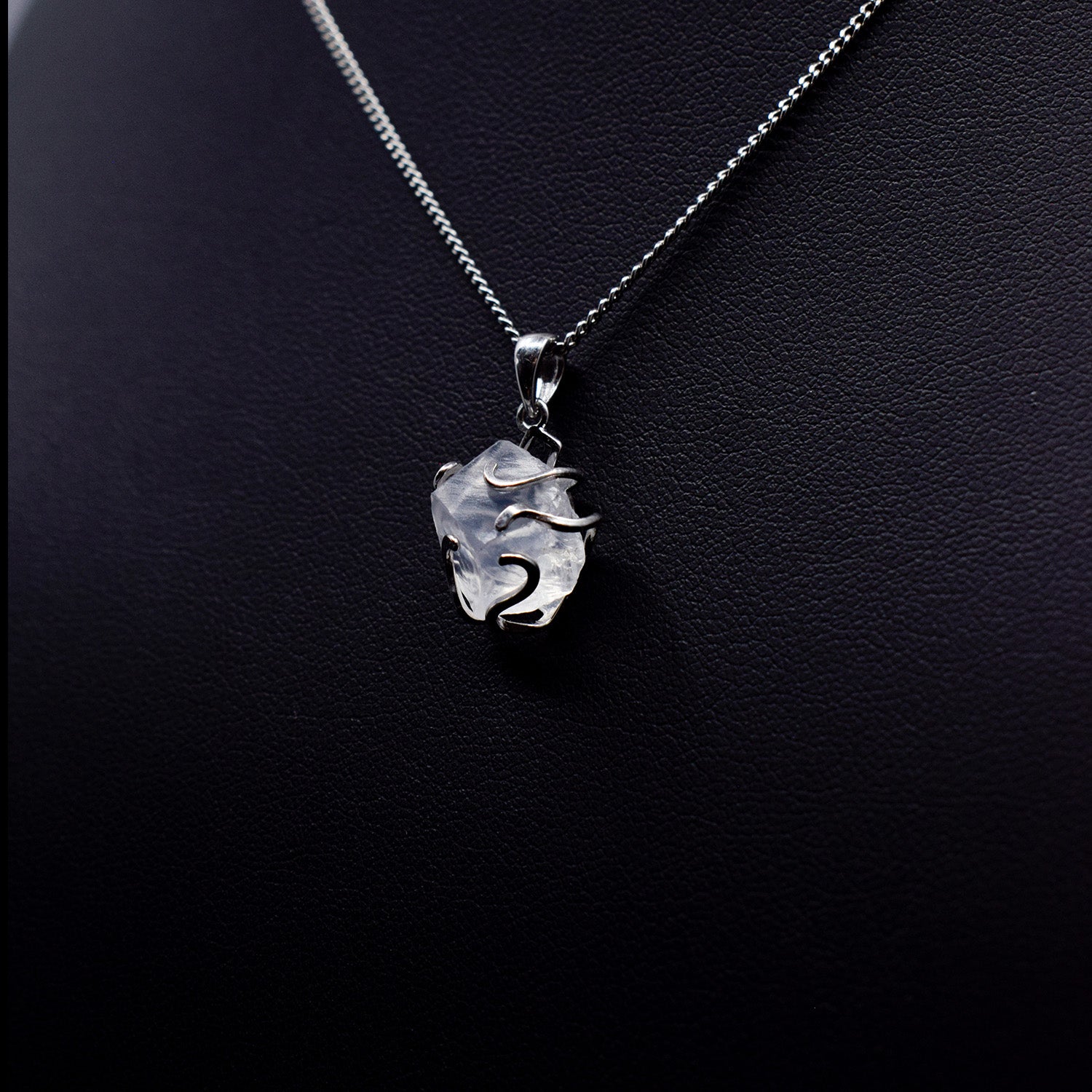 Handgefertigt in der Schweiz aus feinem 925er Sterling-Silber (rhodiniert) und einem seltenen, unbehandelten Mondstein – roh belassen, um sein geheimnisvolles Schimmern in seiner reinsten Form zu bewahren und die Verbindung von Intuition und innerer Ruhe spürbar zu machen.