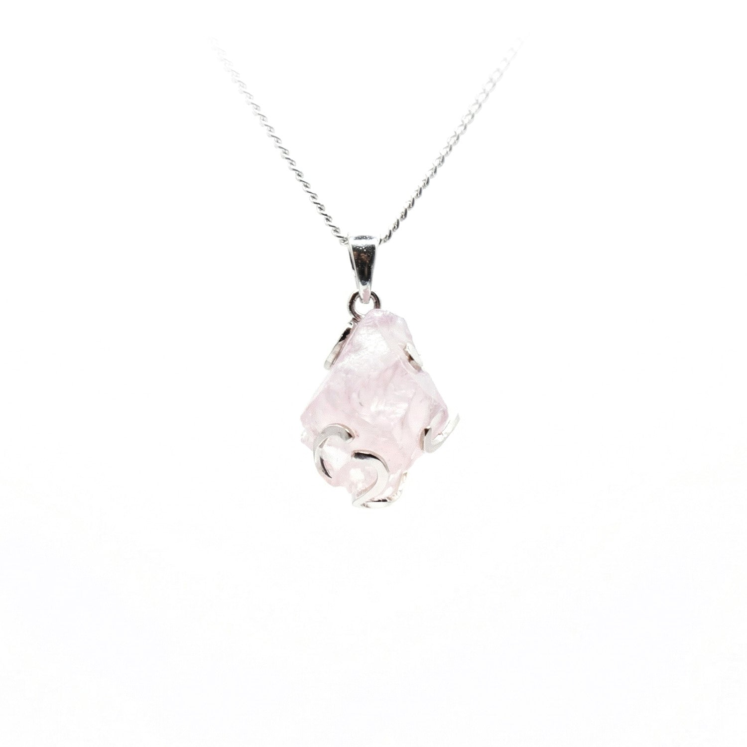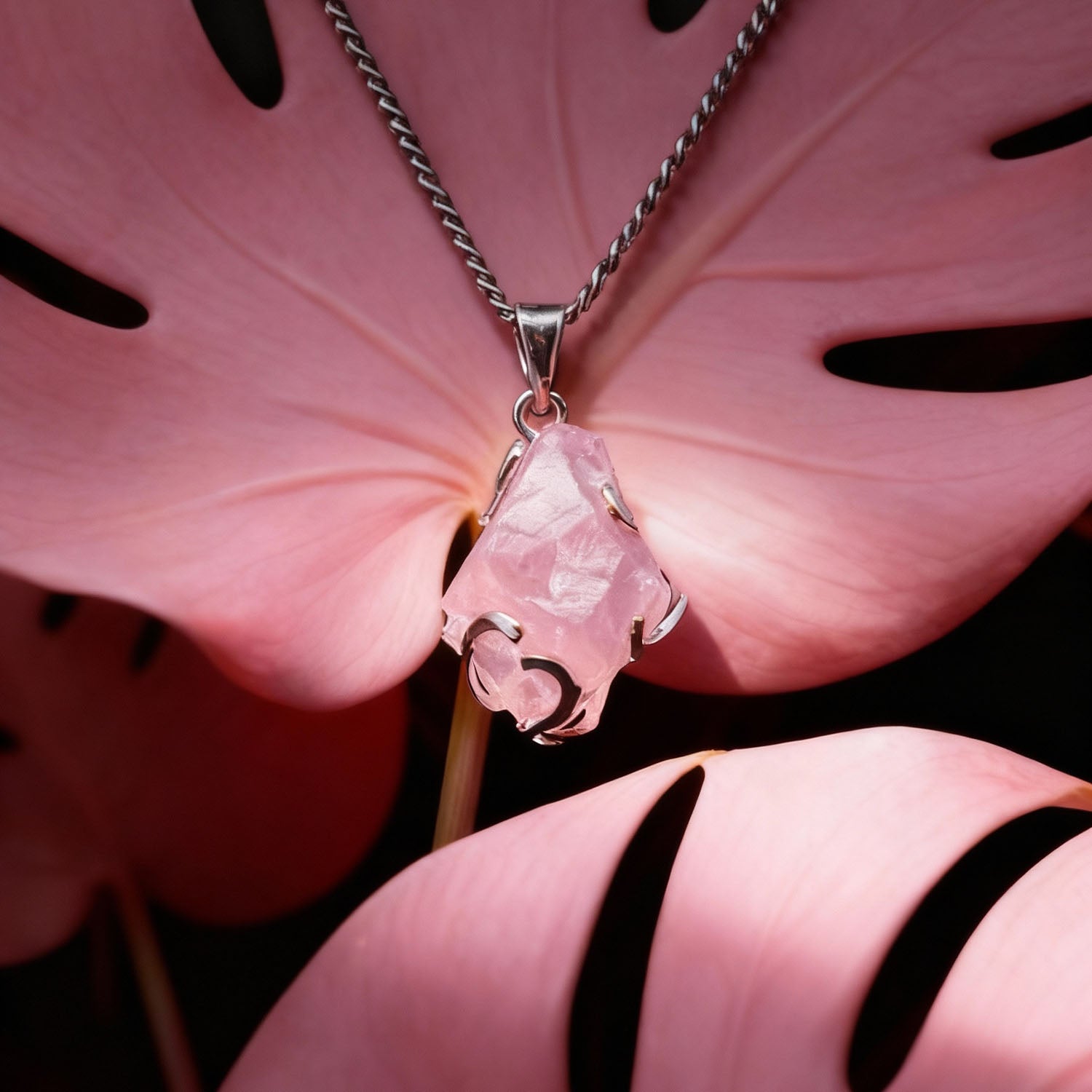 Die Rosalia Halskette präsentiert einen seltenen, unbehandelten Rosenquarz in seiner zarten, natürlichen Farbigkeit, gehalten in einer Krallenfassung aus rhodiniertem Silber. Ergänzt wird das Design durch eine passende, ebenfalls rhodinierte 45-cm-Silberkette aus feinem 925er Sterling-Silber.
