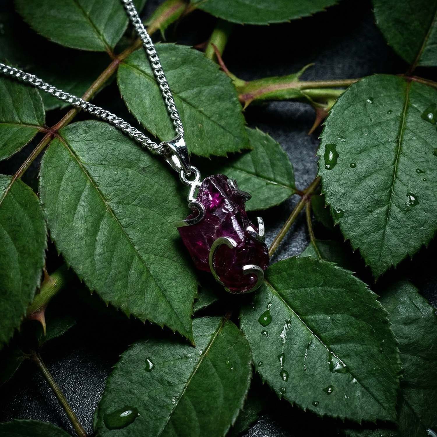 1x Collier: Rhodolith-Granat in natürlicher, unberührter Form, gefasst in 925er Sterling-Silber. Kette inklusive.