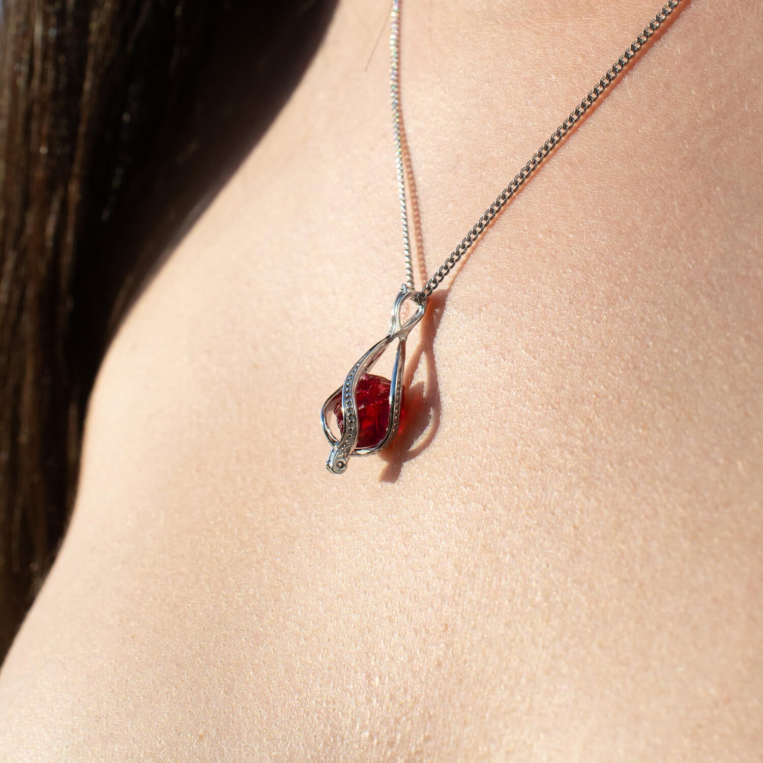 Das Rubra Vitae Collier umschließt einen intensiven, unberührten Rhodolith-Granat in einem kunstvoll geschmiedeten Sterling-Silber-Käfig. Die lebendige Tiefe des roten Edelsteins bleibt unverfälscht erhalten, während das feine Silber ihn umrahmt – ein Sinnbild für Leidenschaft und innere Stärke. Handgefertigt in der Schweiz, verkörpert dieses Collier pure Individualität und eine Energie, die frei und ungezähmt bleibt.